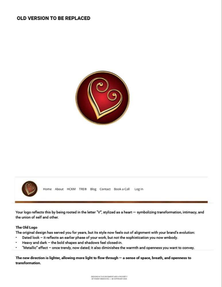 The existing logo — a heart-shaped “V” — carried meaningful symbolism but had become visually dated. Heavy forms, dark tones, and metallic effects created a closed-in feel that conflicted with the openness, embodiment, and calm authority central to the brand.